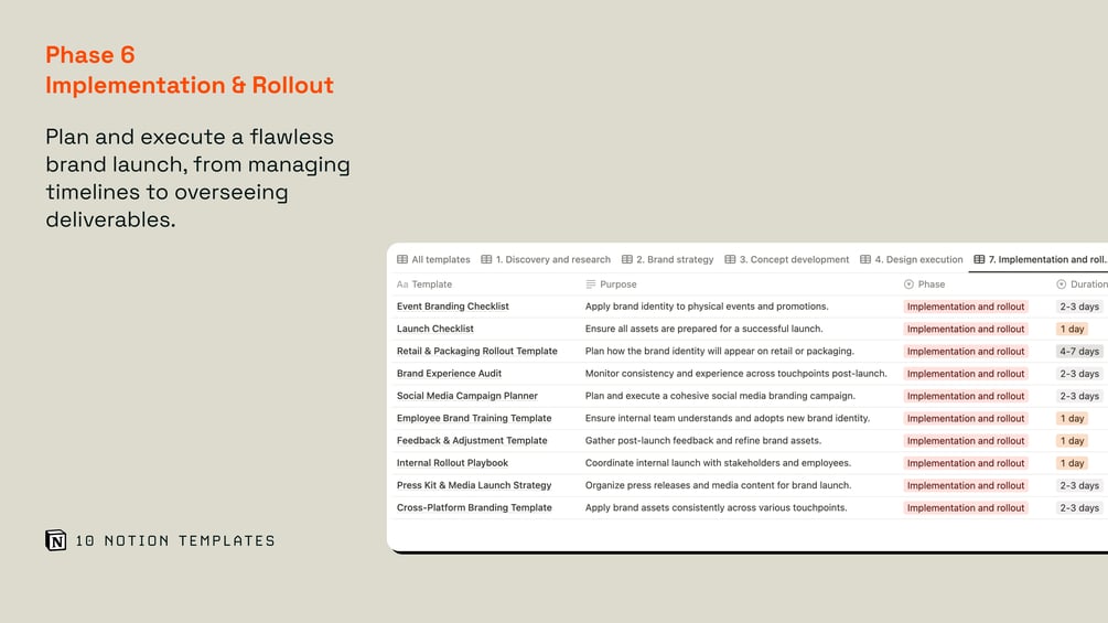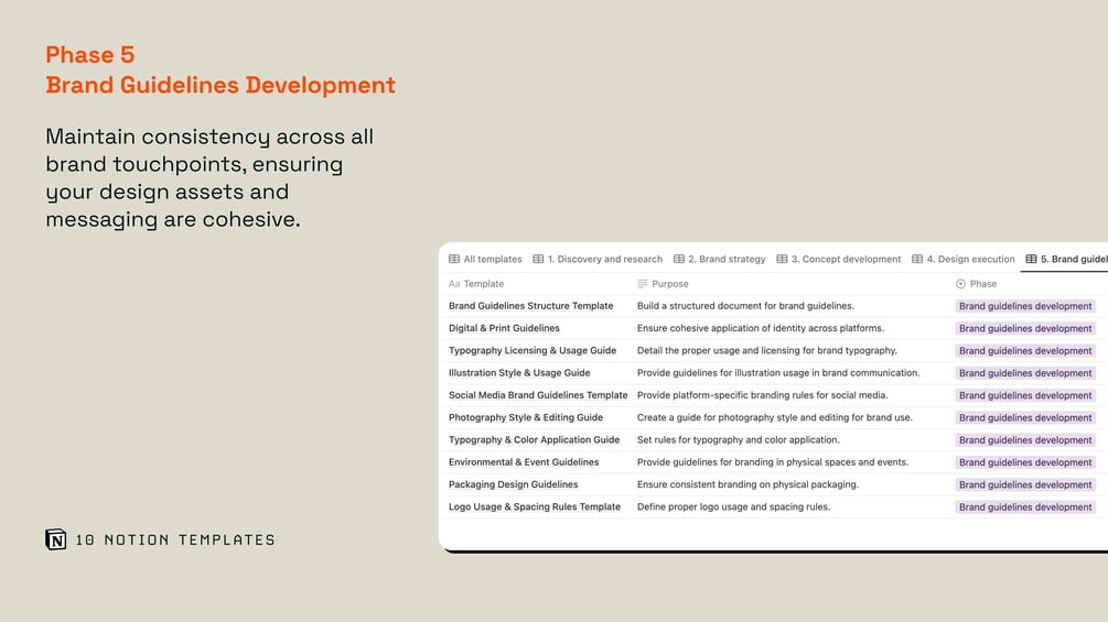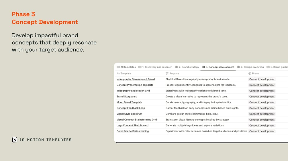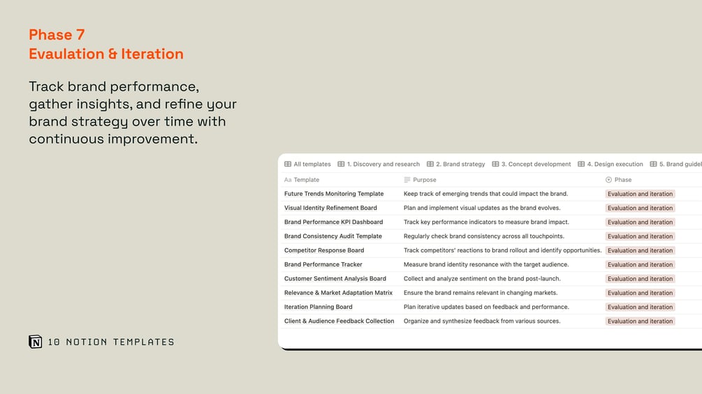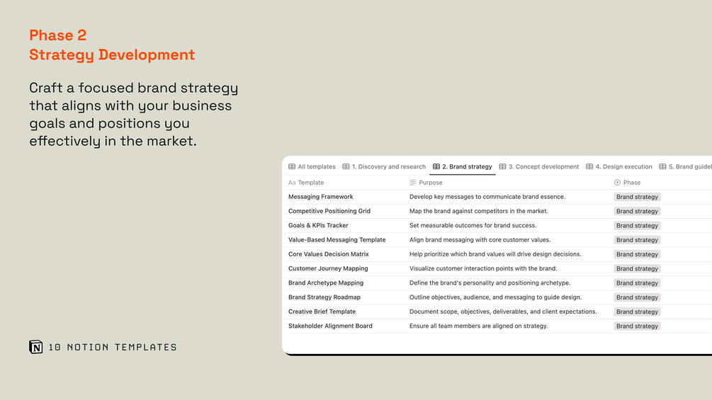 70 Notion templates for structured brand design thinking across phases of work.